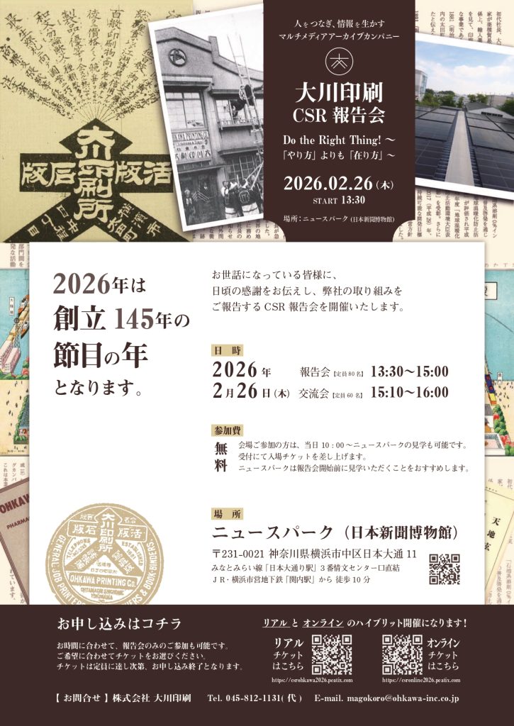 2026年は、弊社にとって創業145年の節目の年となります。お世話になっている皆様に、日頃の感謝をお伝えし、弊社の取り組みをご報告するCSR報告会を開催いたします。