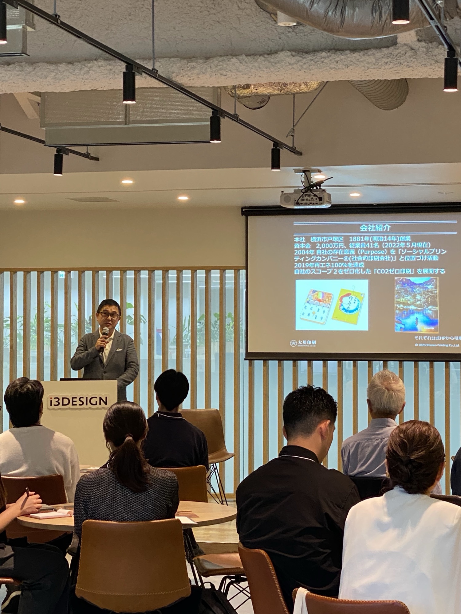 おしゃれな空間で講演させて頂きまし。大川印刷では3年前に長野県の山翠舎さんの協力で、古材を活用したオフィスを作りました。それがきっかけで印刷外の分野の方々にも弊社の取り組みに関心を持って頂きました。