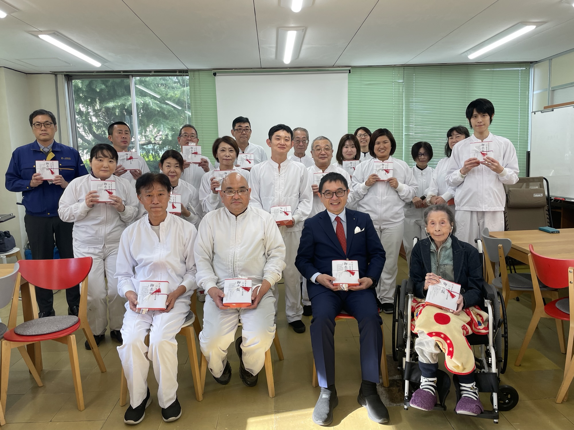 毎年恒例のオリジナル掛け紙を掛けたお赤飯をみんなに手渡ししてささやかなお祝いを終えました。