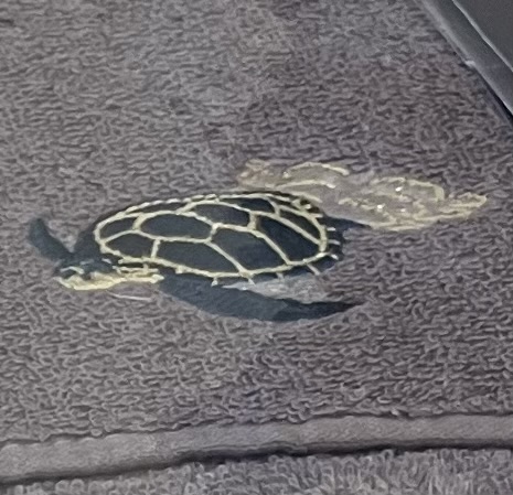 ウミガメは種類によって歩き方が異なり、バタフライをするように這って歩くものや、くろーるのようにこうごに手を使って這い歩く種類のウミガメもいるそうです。産卵の際、上陸したウミガメ調査する際に砂浜に残されたその這って歩いた跡を見てウミガメの種類の判断をするそうですが、刺繍には帆の足跡の違いまで表現しています。