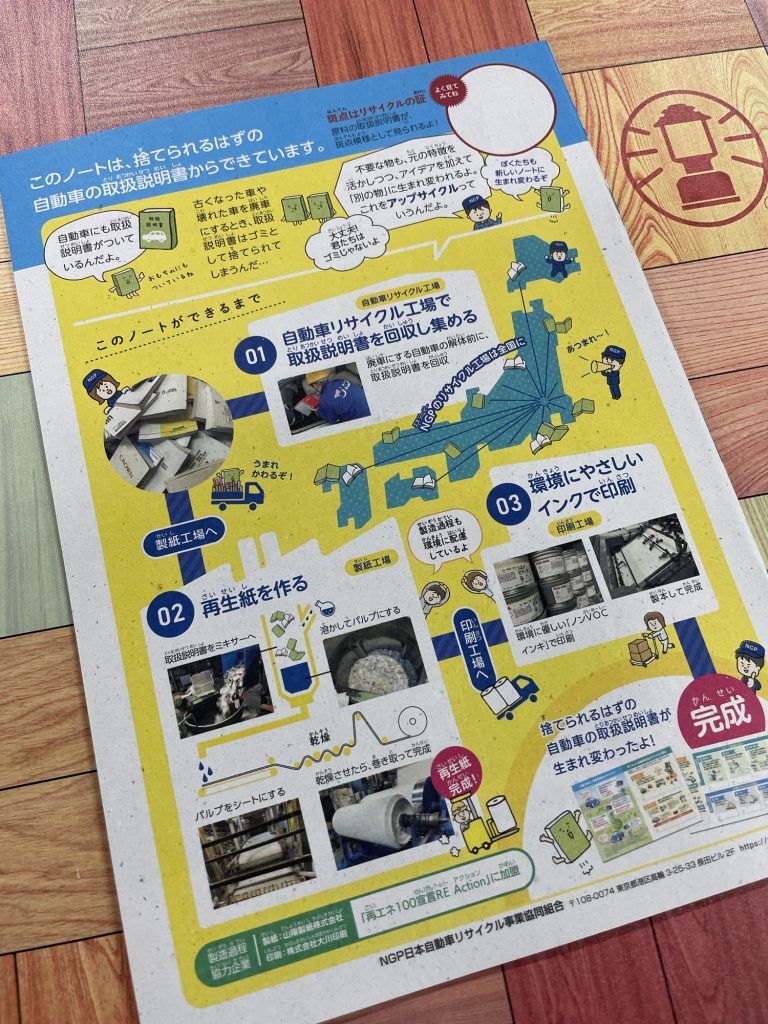 自動車マニュアルを子供が使うノートにアップサイクルの話では、再生紙化の際、漂白剤を弱めにしているため、(環境負荷低減や安全性向上の稀に元の取扱説明書の文字が残っている話を興味深そうにノートを眺めながら聴いてくださいました。