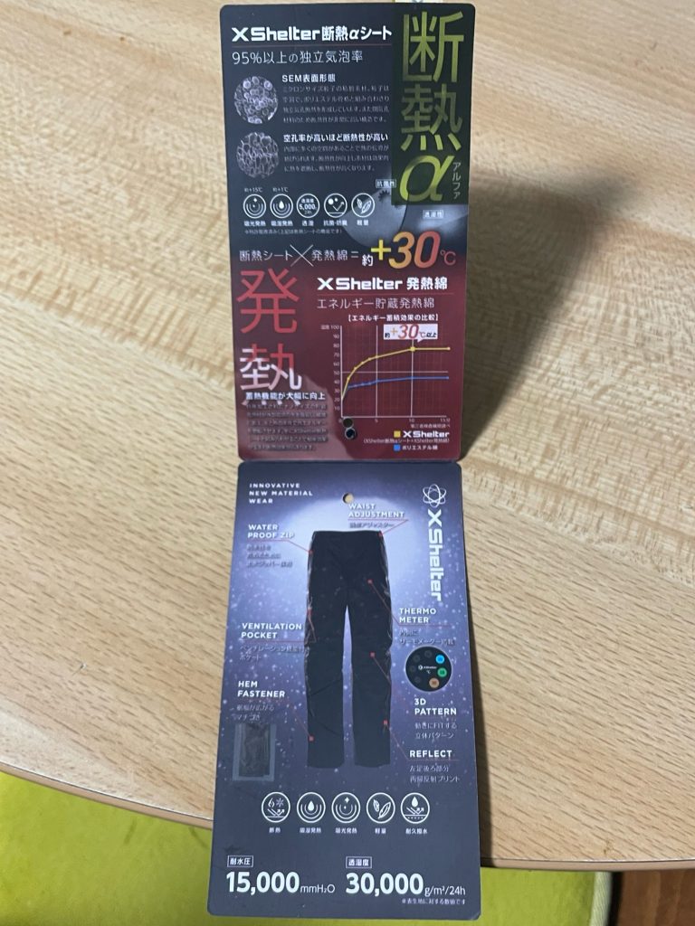 元々ニュースでアルミを使った新素材に興味がありましたが見に行ったら是非体験したいと思い。購入してきました。残念ながら型違いも売り切れで防寒のパンツとベストを購入しました。