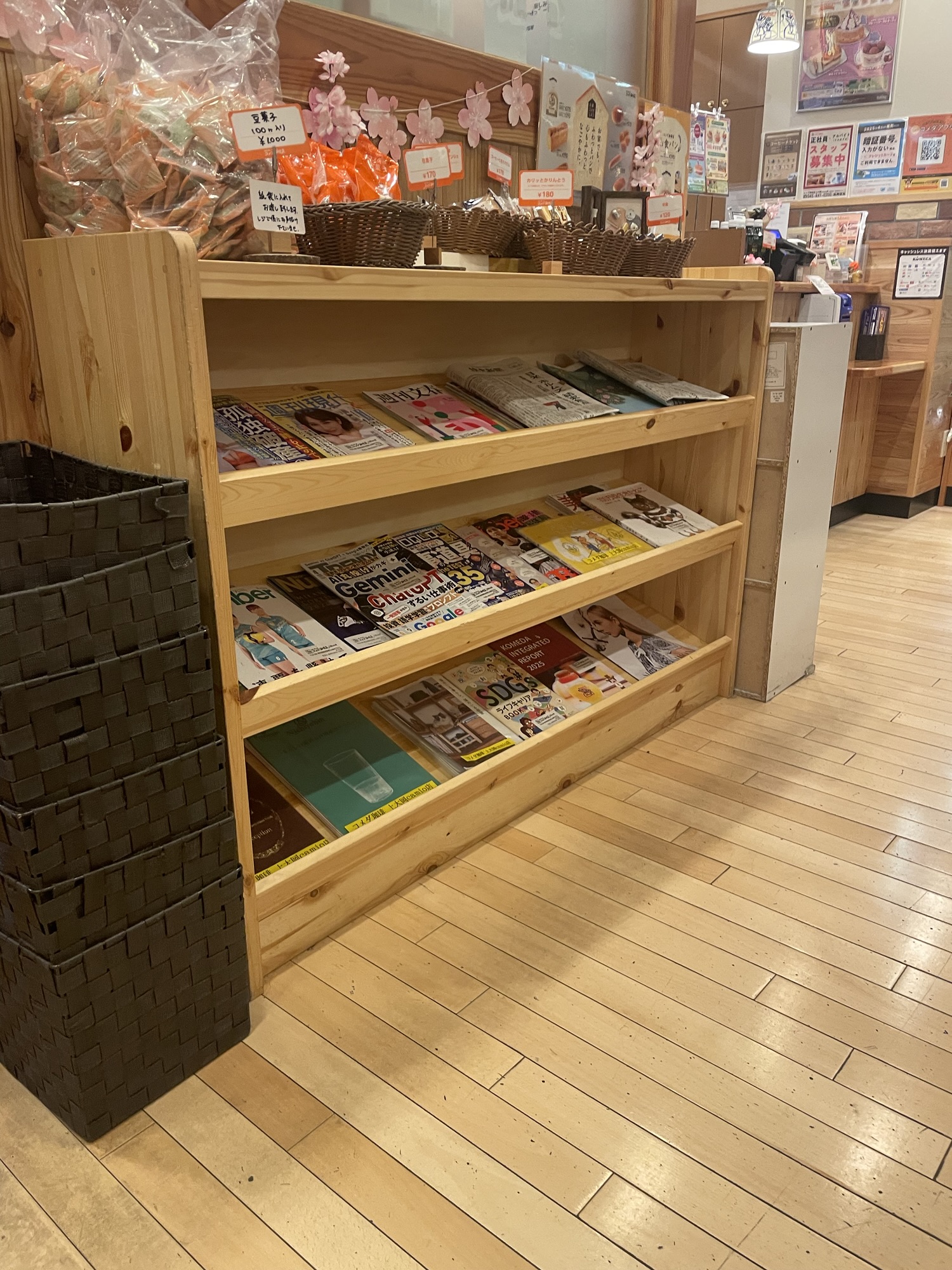 人気のコーヒーショップ。店内で順番待ちをする席の目につく場所にあるのは、書棚に並べられた雑誌類です。中には「SDG’sライフキャリア」なんて言う本まで。