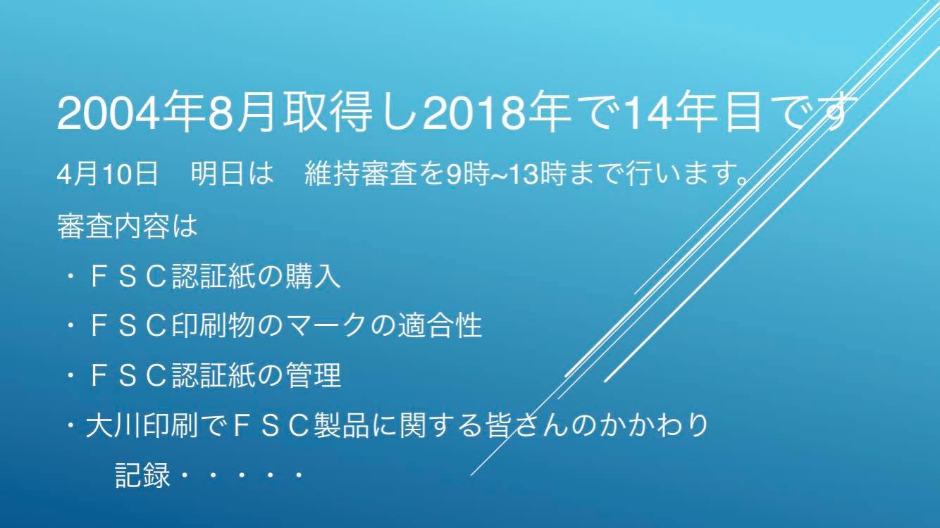 写真は常務が朝礼で使用したスライド。審査を迎えるにあたり、再度関心と注意の喚起を行った。