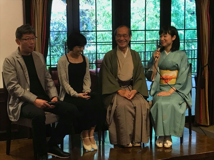 右から「和える」矢島代表、京都市門川市長、つづれ織り職人の森紗恵子さん、そして京焼の窯元「丈夫窯」の加藤丈尋さん
