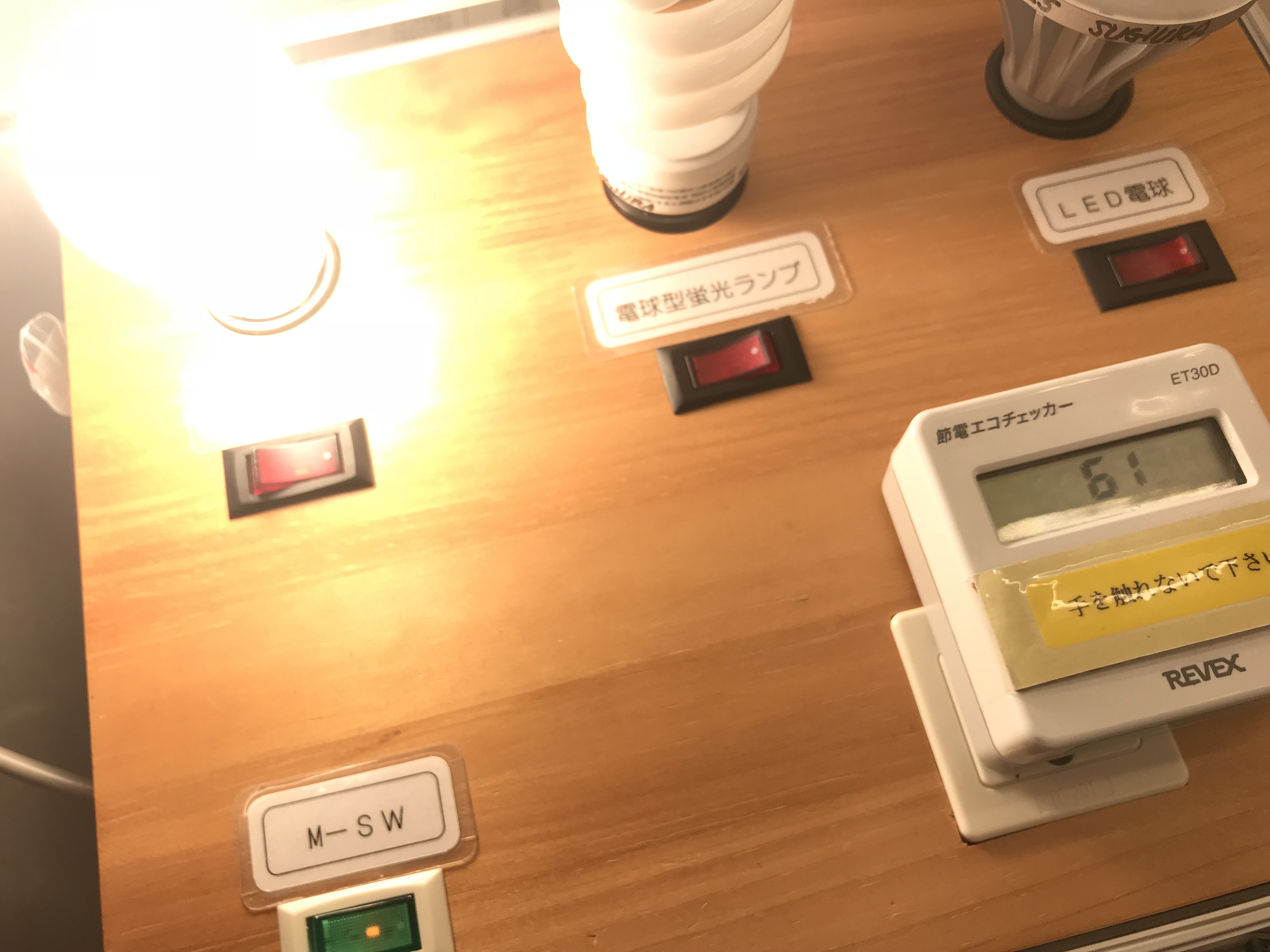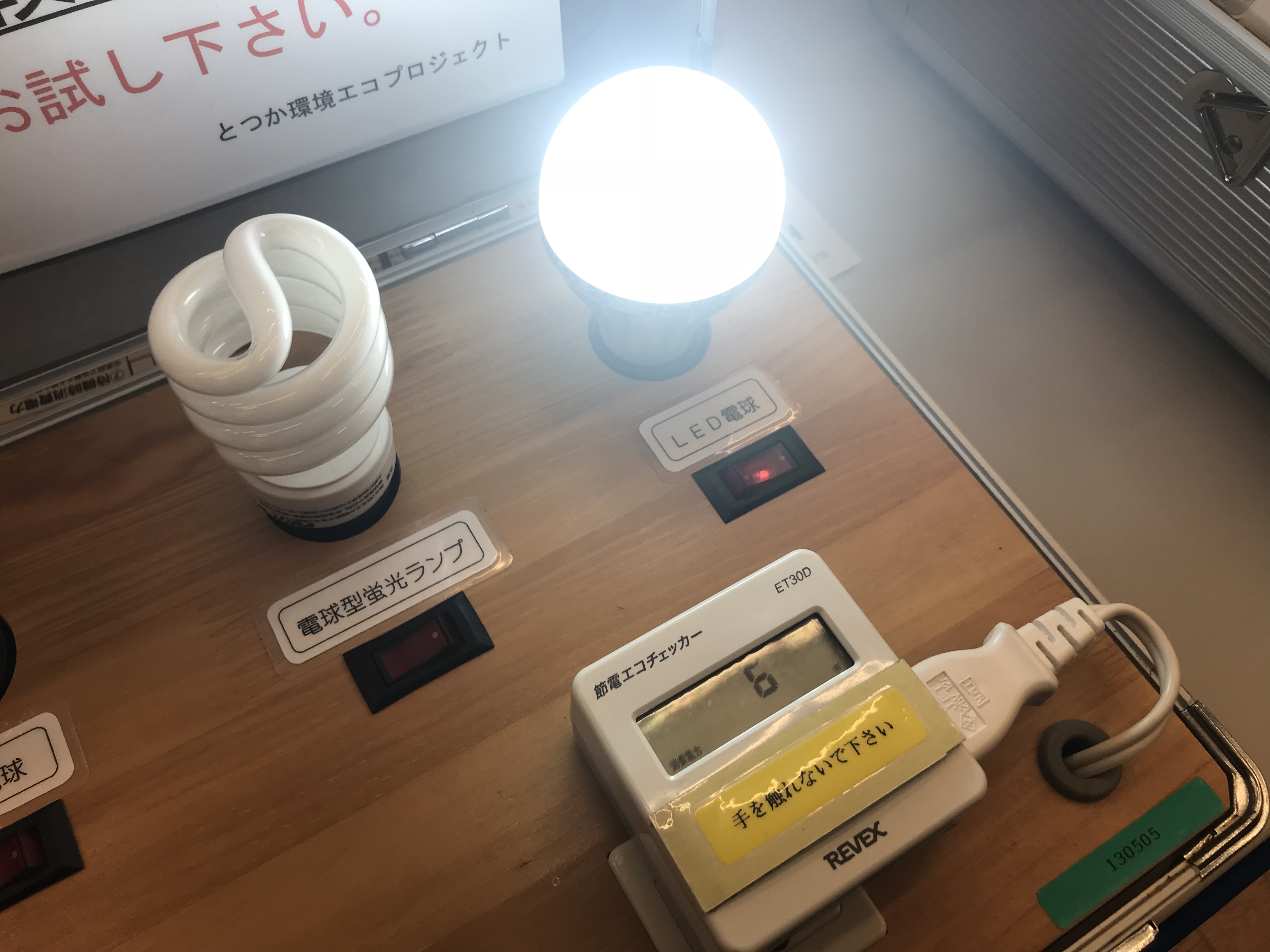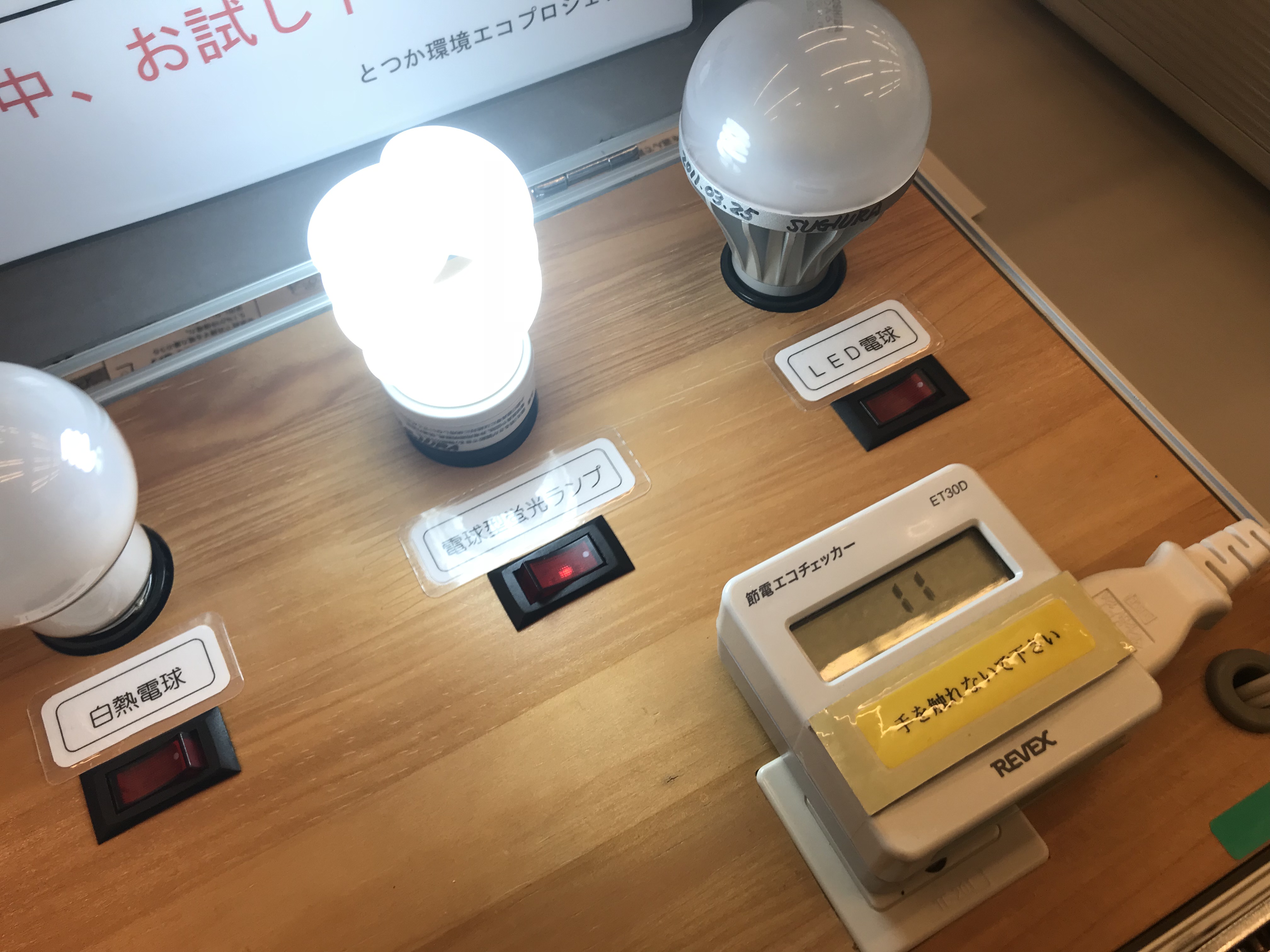 同じ70Wの電球もそれぞれ消費電力が大きく異なることを示す展示
