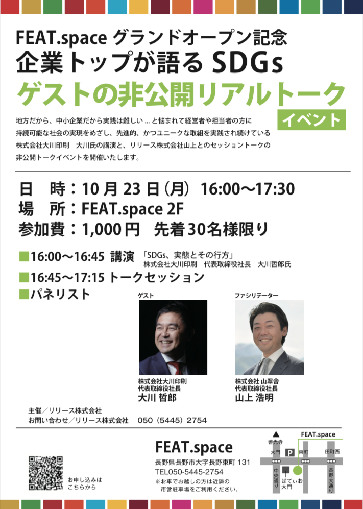 FEAT.spaceグランドオープンを記念して、10月23日(月)に長野で開催されますトークイベントに代表・大川が登壇し、「SDGs、実態とその行方」というテーマで講演をさせていただきます。
